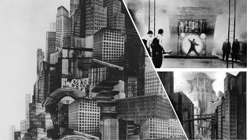 Métropolis de Fritz Lang (1927) décrit une société dystopique qui sépare l’humanité entre ville haute et ville basse dans des décors de machines folles. Considéré par l’Unesco comme « le symbole d’un modèle d’architecture cinématographique du futur », il devient en 2001 le premier film inscrit sur le Registre de la Mémoire du monde de l’UNESCO