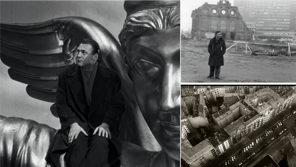 La ville réelle comme personnage sous la caméra de Wim Wenders dans Les Ailes du désir (1987), où l’architecture d’un Berlin nocturne avant la chute du mur devient le cadre d’une poétique et mélancolique errance.